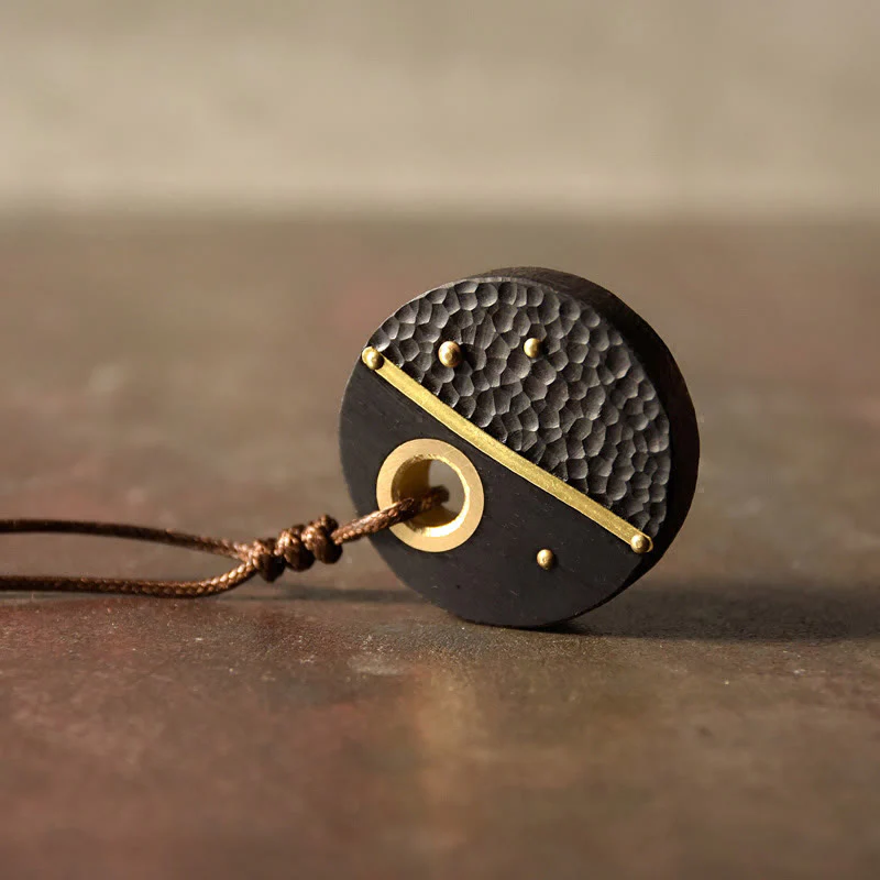 This handcrafted necklace, with a round ebony wood and copper pendant, is a masterpiece of skilled craftsmanship. Using high-quality materials, it symbolizes peace and positivity. Ideal for those seeking good luck and meaningful change, it's perfect for everyday wear or as a thoughtful gift.