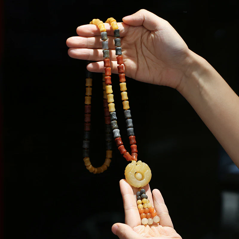 This beautiful Golden Silk Jade pendant necklace is believed to ward off evil spirits and bring good fortune. It's a stone of purity and nourishment, associated with luck and wealth. Handmade by master craftsmen with natural, high-quality materials.