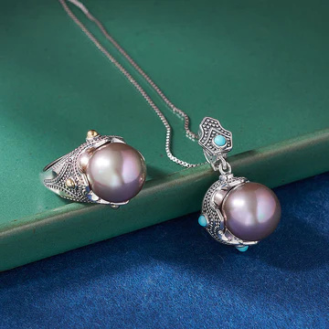 Buddha Stones 925 Sterling Silver Shell Bead Pearl Healing Necklace Pendant Ring Set
